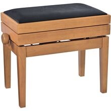 Højdejusterbar pianobænk i massivt træ med opbevaring, natur mat finish og sort veloursæde