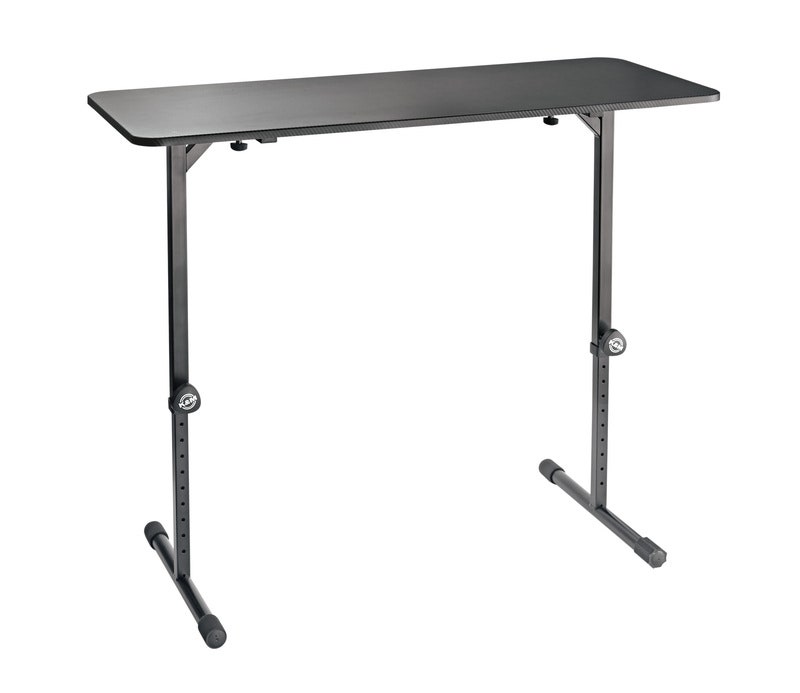 Mobilt bordstativ til DJ'en eller andre, der har brug for stabil bordplads. Pladen på 1100 x 455 mm af MDF er beklædt med en slidstærk plastcoating der tåler mange års hårdt liv på landevejen. Stativet kan stilles i højden fra 605 - 1055 i 30 mm trin via fjederbelastede håndskruer, og kan foldes helt fladt sammen. Kan evt udvides med hylde 12162 til laptop eller andet.