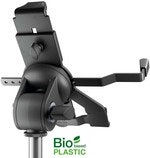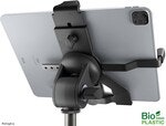 Universal tabletholder til alle tablets med en ca. størrelse på 10" til 16". Tabletholderen er lavet af 50-100% biobaseret plastik. Brugen af vedvarende råmaterialer hjælper med at reducere CO2-udledning. Læs mere om K&M's biobaserede plast på: bioplastic.k-m.de. Holderen kan indstilles trinløst mellem 158 og 280 mm. Holderen er også særligt velegnet til tablets med et beskyttende cover eller etui på op til 20 mm tykkelse. De overlappende spændekæber med integrerede gummipuder giver et sikkert hold og eliminerer uønskede vibrationslyde. Et justerbart monteringsbeslag med filtpolstring giver ekstra sikkerhed, når tabletholderen er placeret lodret og forhindrer enheden i at falde ud, selv ved hårdt brug. Holderen kan drejes og vippes frit. Drejebevægelsen kan justeres fra let til sej via en spændeskrue og holderen kan uden videre drejes mellem stående og liggende format. Holdearen kan monteres på ethvert stativ med standard 3/8" M-gevind.
