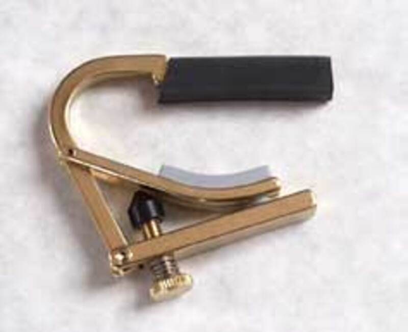 This capo is designed to be applied from the bass side, with a step built in to skip over the bass E string, and it centers properly for improved stability. Brass.