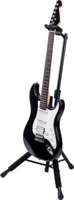 Artikelnummer 4075135Guitar Stand with upgraded Auto Grip function. Tri pod model where the guitar is hanging and the body lean to the legs.
