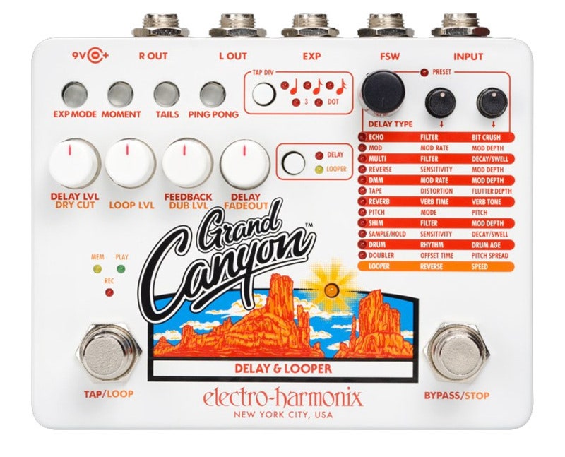 Grand Canyon er EHX’s mest avancerede multifunktions delay og looper pedal. Den er udstyret med 12 effekttyper plus en fuldt udstyret looper, der er i stand til at optage og overdubbe Grand Canyons effekter. Pedalen har uovertruffet lydkvalitet, op til tre sekunders delay-tid, tap tempo og ni tap divide-indstillinger, stereoudgang, 13 preset-pladser, programmerbare EXP-pedalindstillinger, højkvalitets analog bypass med soft switching og meget mere.
