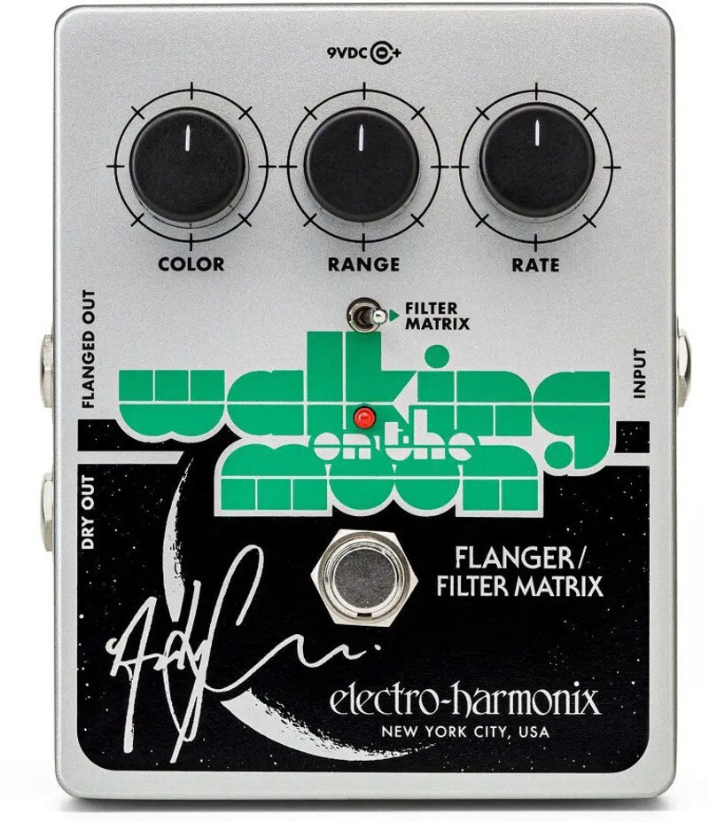 Walking on the Moon er som andre EHX-flangerpedaler udrustet med en FILTERMATRIX, som kobler LFO'en fra flangerkredsløbet, og fryser modulationen, hvilket giver en fast filtereffekt, som kan tilføje klokkeagtige eller metalliske overtoner til din lyd. En separat DRY-udgang giver dig mulighed for at sende dit tørre signal videre udenom det våde. En særlig Artist Edition-grafik med Andys signatur pryder chassiset, og en Walking on the Moon-plakat med kunst af Laura Josephson er inkluderet med hver pedal.