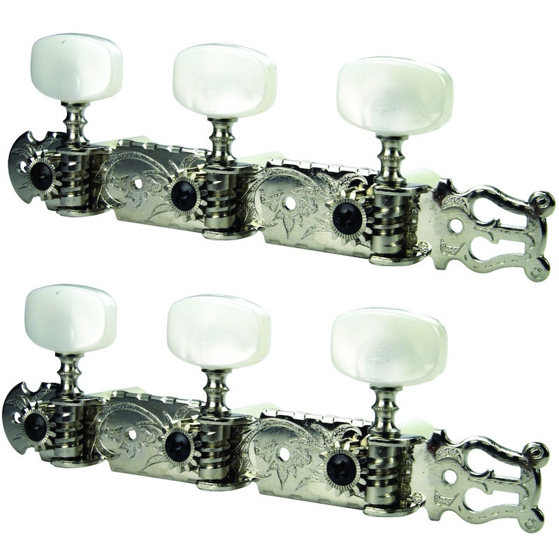 Tuner for nylonstringed classical guitar. Nickel, white pearloid buttons.