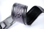 Smukt dekoreret klassisk læderrem med indsyet skum og særligt tofarvet mønster. Bredden er på 6,35 cm og længden kan justeres fra 104 til 137 cm.