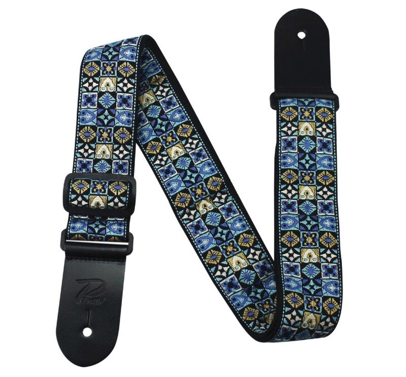 Artikelnummer 3421701Jacquard-vævet guitarrem i stærk slidstærkt stof. Blåt mønster.