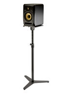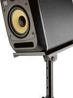 Moderne gulvstativ til mindre studiemonitors med elegant 3-fod og vipbar topplade med læbe.