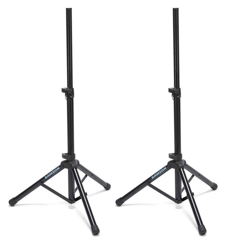 - Two heavy duty, telescoping speaker stands, each with tripod base