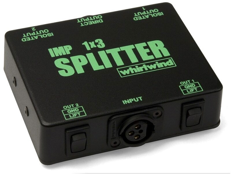 Splitbox til mikrofon, D3F-indgang til balancerede D3M-udgange, hvoraf en overfører evt. phantom power.