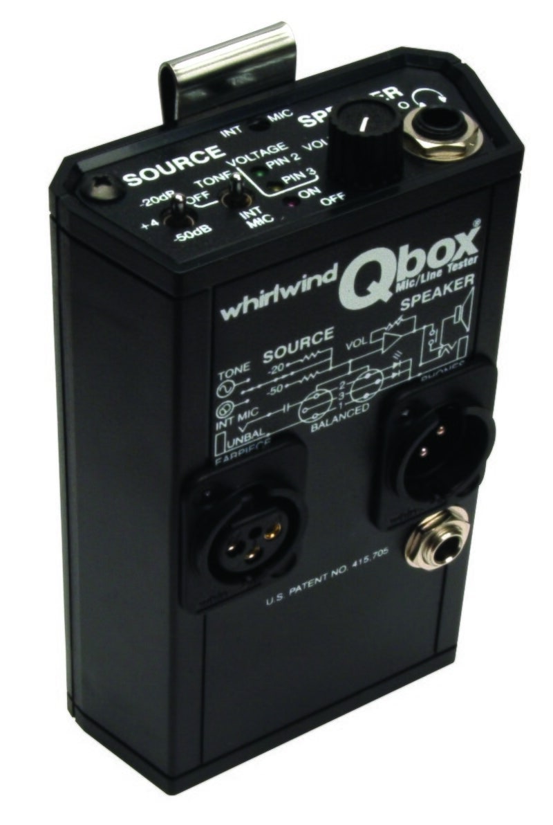 Batteridrevet box til test af apparater og kabler. Indbygget mikrofon, tonegenerator, højtaler, hovedtelefon-forstærker og LED-indikatorer til detektering af phantom power og indkommende signal.