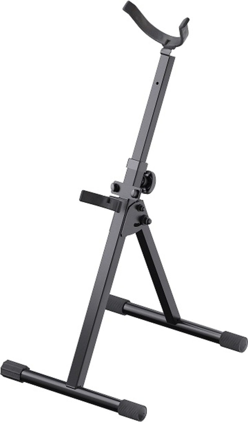 Ekstremt stabilt sammenklappeligt stativ til tunge bassaxofoner. Takket være en række justeringsmuligheder er stativet velegnet til en lang række størrelser og modeller. For eksempel kan afstanden mellem de to gummierede, beskyttende instrumentstøtter indstilles fra 70 til 880 mm. Den solide stålkonstruktion med den slidstærke pulverlakering er nem at håndtere og derfor ideel til øvelokale, studie eller mobil brug. En justerbar endekappe gør også stativet slingrefrit.