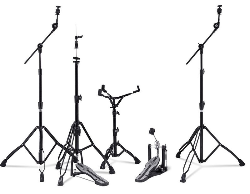 - Mars Hardware pack innehållande P600 bastrumpedal, H600 Hi-hatställ, S600 virvelställ, 2x B600 cymbal bomställ. Svart.