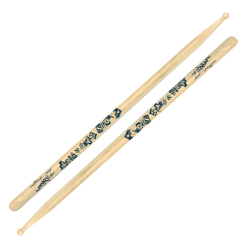 Travis Barker er især kendt for sin utrolige hastighed med meget egale slag og en særlig "pocket". Udover Blink 182 har han spillet for og med et utal af rock-artister. Hans stikker er list længere end standard og tæt på 5B i tykkelse, men med et stort rundt hived, der resulterer i en mere egal klang, uanset slagvinkel. Her i naturudgaven med "Stars & Straps"-tryk. Fås også i en sortlakeret udgave med sølvtryk og i hvid med blå/rød tryk.